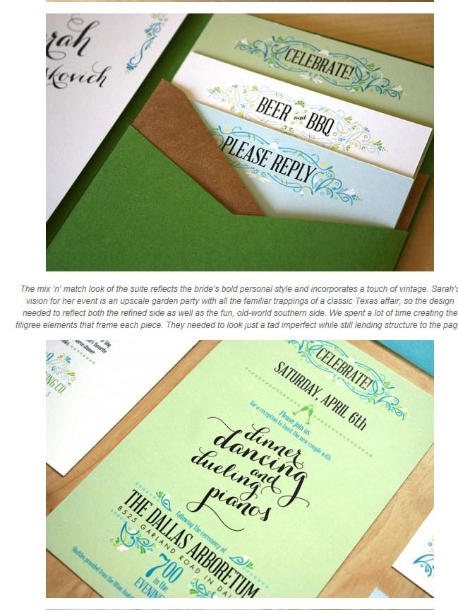 テキサスのガーデンパーティーの結婚式の招待状 これらの結婚式の招待状は、このような春の楽しみです! のクリステンによって作成されたマウンテン紙ダラスの春の結婚式のために、スイートはかなりヴィンテージ風花飾りと一緒に緑と青のカラーパレットを備えています。 私のお気に入りの部分? 花嫁は招待スイート全体含めた遊び心符!